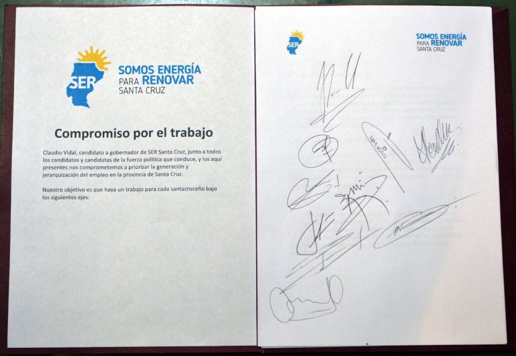 Firmas de los candidatos de SER Santa Cruz en el Compromiso por el Trabajo.